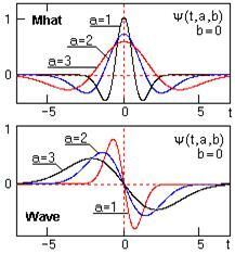 Определение вейвлета.  К вейвлетам относятся локализованные функции, которые конструируются  из одного материнского вейвлета y(t) (или по любой другой независимой переменной) путем операций сдвига по аргументу (b) и масштабного изменения (а):