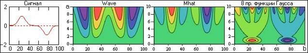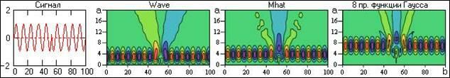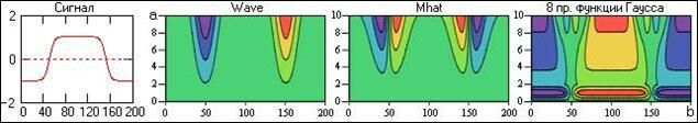 Форма вейвлета (четность или нечетность), доминирующая частота и степень ее локализации существенно влияют на вейвлет-спектры анализируемых сигналов и на возможности выделения его локальных особенностей. На нижеследующих рисунках приведены сравнительные спектры простых сигналов при использовании вейвлетов Wave (нечетный, рис. 2.1.3), Mhat (четный, рис. 2.1.5) и вейвлета по 8-й производной Гаусса (рис. 2.3.9-2.3.16), который также является четным, и имеет в 4 раза более высокую доминирующую частоту, чем вейвлет Mhat.