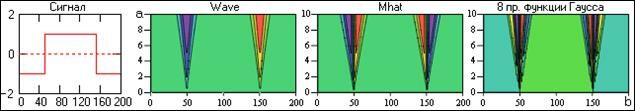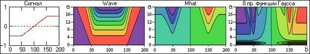 Вейвлет-преобразование, выполняемое при анализе сигналов для выявления в них каких-либо особенностей и места их локализации без обратной реконструкции, допускает применение любых типов вейвлетов, как ортогональных, так и неортогональных. Чаще всего для этих целей используются симметричные вейвлеты. Ниже приводятся результаты применения вейвлета Mhat для анализа сигналов простых форм. Вычисления выполнены с вейвлетом (2.1.3) по формуле: