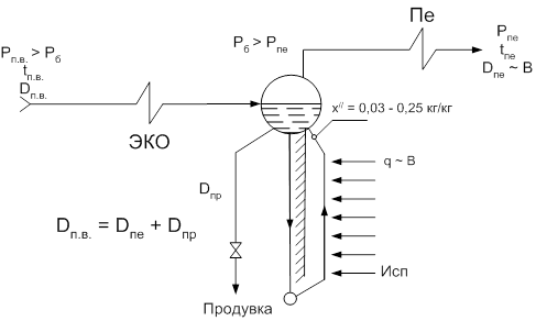 2. В ЭКО и Пе вода и пар движутся за счёт разности давлений Pп.в. > Pб, Pб > Pпe. В топках экранных – многократная естественная циркуляция за счёт движущегося напора: при tнас = 310 ÷ 340 0С