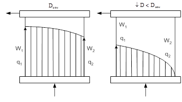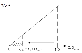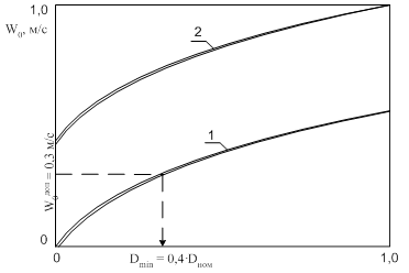 По условию W0доп = 0,3 м/с в самых необогреваемых трубах минимальная нагрузка: Dmin = 0,4·Dном , ниже нельзя.