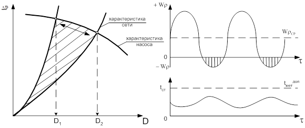 → ↑∆Р ~ V2, т. е. рабочая точка выходит за пределы возможностей Д(В) по напору и производительности.