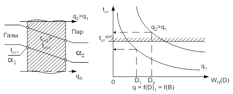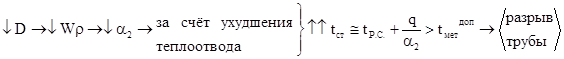 В отдельных трубах, когда W2 << W1, а q2 > q1 → пережог труб за счёт ↓α2 и ↑tР.С..