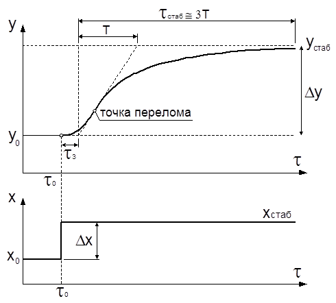 Нестационарные процессы сопровождаются динамическими характеристиками, которые показывают изменение рабочих параметров (y) во времени при нанесении возмущения определенной входной величины (Dx). Данные зависимости используют в системах автоматического регулирования.