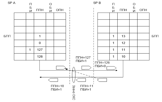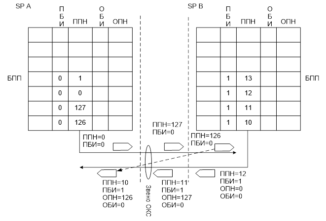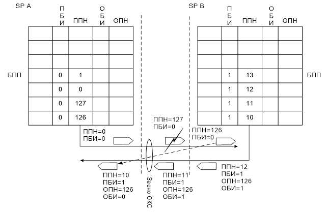 При принятии искаженной ЗНСЕ в обратном направлении ОПН указывается равным ППН последней правильно принятой ЗНСЕ. А ОБИ инвертируется по сравнению с его значением в предыдущей СЕ. Эти значения ОПН и ОБИ передаются во всех последующих СЕ до тех пор, пока не будет принята повторно правильно ЗНСЕ с противоположной стороны.