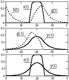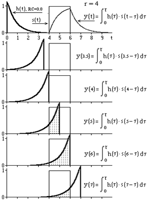 На рис. 3.2.1. приведен пример выполнения свертки прямоугольного импульса  с импульсным откликом RC-цепи, площадь которого нормирована к 1. Если площадь импульсного отклика h(t) равна 1, то площадь выходного сигнала свертки всегда должна быть равна площади входного сигнала, что можно видеть на верхнем графике рисунка, при этом одномасштабное сравнение  входного и выходного сигналов наглядно демонстрирует характер преобразования сигнала в данной системе. На последующих графиках рисунка демонстрируется вычисление результатов свертки в ряде последовательных точек ti = {3.5, 4, 5, 6, 7} временной оси. В силу отрицательного знака t в аргументах функции s(t-t) интегрирование произведения h(t)s(t-t) выполняется назад по времени и может ограничиваться только определенной длиной значимых значений импульсного отклика (которая в данном случае установлена равной r = 4), а результат относится к начальной точке h(0) импульсного отклика. Так как входной сигнал, рассмотренный на рисунке, представляет собой прямоугольный импульс с амплитудой 1, то интеграл свертки в каждой текущей точке расчета равен площади импульсного отклика в пределах границ входного прямоугольного импульса (заполнено точками).