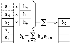Еще более наглядна техника выполнения цифровой свертки, приведенная на рис. 3.2.2. Для вычисления свертки массив одной из функций (sk - входного или свертываемого сигнала) располагается по ходу возрастания номеров. Массив второй функции (hn - более короткой, которая обычно называется оператором свертки или оператором фильтра), строится параллельно первому массиву в обратном порядке (по ходу уменьшения номеров первого массива или в режиме обратного времени). Для вычисления yk значение h0 располагается против sk, все значения sk-n  перемножаются с расположенными против них значениями hn и суммируются. Результаты суммирования являются выходным значением функции yk, после чего оператор hn сдвигается на один номер k вперед (или функция sk сдвигается ему навстречу) и вычисление повторяется для номера k+1 и т.д.