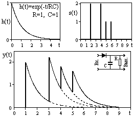 Если функция импульсного отклика системы известна, то, с учетом принципа суперпозиции сигналов в линейной системе, можно выполнить расчет реакции системы в любой произвольный момент времени на любое количество входных сигналов в любые моменты времени их прихода путем суммирования запаздывающих реакций системы на эти входные сигналы. На рис. 3.1.2 приведен пример входного сигнала s(t) для RC-цепи в виде последовательности импульсов и  реакция системы y(t) на такой входной сигнал, образованная суммированием реакций системы на каждый импульс.
