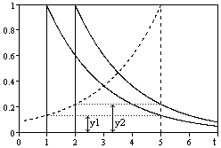 Однако эту же операцию можно рассматривать и с другой позиции. Развернем импульсный отклик h(t) системы на 1800 и поместим его начало h(0) непосредственно в точку, для которой нужно выполнить расчет выходного сигнала, т.е. в точку t=5 для нашего примера. Если теперь отсчет координат для функции h(t) повести назад от точки расчета по аргументу t, т.е. перейти на вычисление h(t), где значение t изменяется от 0 и далее (в пределе до  ¥), то нетрудно убедиться (на рисунке это наглядно видно), что функция h(t) пересечет входные импульсы на тех же значениях у1 и у2. Для этих точек пересечения первого и второго импульсов соответственно имеет место t1 = t-t1 и t2 = t-t2, как и при прямом методе расчета запаздывающих реакций при расчете значений h(t-t1) и h(t-t2). После умножения полученных значений h(t1) и h(t2) на значения входного сигнала А и В получаем полную аналогию: y1 = A×h(t1) = A×h(t-t1) и y2 = B×h(t2) = B×h(t-t2), и соответственно суммарный сигнал у = у1+у2.