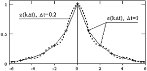 Отсчеты s(kDt) и огибающая их кривая на рисунке 5.2.3 повторяют (в более детальном масштабе) сигнал s1(t) на рис. 5.2.1, дискретизированный с шагом Dt = 1. Как уже отмечалось, интервал дискретизации данного сигнала оказался завышенным, и спектр сигнала искажен (рис. 5.2.2). При выполнении операции s(kDt) Þ S(nDf) количество точек дискретизации спектра S(nDf) было увеличено в 5 раз по отношению к количеству точек сигнала s(kDt), т.е. Nf = 5Nt. При обратном преобразовании S(nDf) Þ z(kDt), были выполнены условия (5.2.15-16), при этом шаг дискретизации сигнала при его восстановлении оказался также в 5 раз меньше исходного (Dt = 0.2). Результат можно видеть на рис. 5.2.3 (кривая z(kDt)). Абсолютно такой же результат дает и интерполяция сигнала s(kDt) рядом Котельникова-Шеннона с переводом на шаг Dt = 0.2. Искажение аналогового сигнала закладывается при его дискретизации, если шаг дискретизации не удовлетворяет условию (5.2.5), и при любых дальнейших преобразованиях уже не может быть исправлено, т.к. информация о первоначальной форме аналогового сигнала при некорректной дискретизации утрачивается безвозвратно.