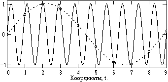 Рис. 5.2.4. Искажение сигнала при некорректной дискретизации (¾ аналоговый сигнал, o - отсчеты с шагом Dt=1, - - - "кажущийся" сигнал). |