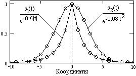 Как правило, шаг дискретизации сигнала (шаг числовых данных в массивах) условно принимают равным Dt = 1, при этом главный частотный диапазон занимает интервал -0.5£f£0.5, или, в шкале угловых частот, соответственно -p £ w £ p. Примеры равномерной дискретизации аналоговых сигналов s1(t) = exp(-a|t|) и s2(t) = exp(-bt2) (дискретные отсчеты нанесены кружками) и спектры этих дискретных сигналов приведены на рис. 5.2.1 и 5.2.2.