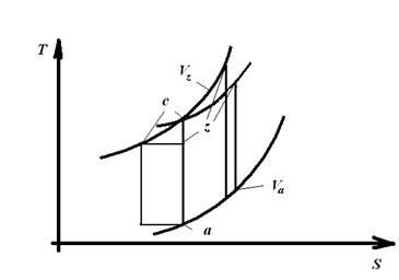 Рис. 1.1. Термодинамические циклы поршневого ДВС: Vz – изохора минимального объема; Va – изохора максимального объема; а – общая начальная точка циклов, соответствующая параметрам окружающей среды, с – точка конца сжатия для различных циклов; z – точка конца подвода теплоты для различных циклов