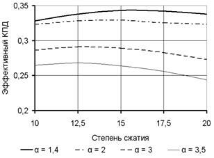 Рис.1.2. Зависимость эффективного КПД от степени сжатия при различных нагрузках