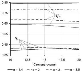Таким образом, варьирование степени сжатия в диапазоне от 12,5 до 20 практически не влияет на эффективный КПД двигателя на полной нагрузке. Если учесть, что большинство транспортных двигателей эксплуатируется на частичных режимах (меньше половины максимальной мощности) до 50 – 70% общего времени, а на режимах холостого хода до 40%, то можно констатировать, что снижение степени сжатия до значений 12,5 - 15 не повлечёт ухудшения экономичности. При этом уровень нагрузок на элементы двигателя (рис. 1.4) значительно уменьшится (до 30%).