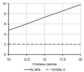 Рис. 1.4. Зависимости максимального давления и максимальной температуры цикла от степени сжатия.