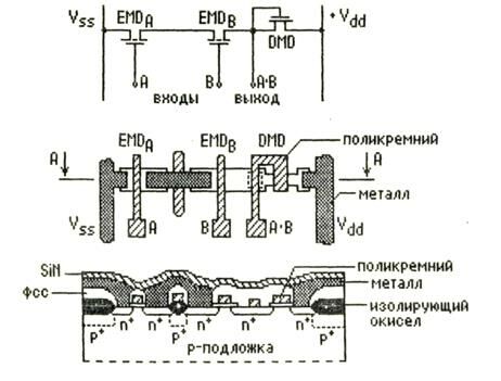 На рисунке 2.7 показана базовая ячейка (логический вентиль И-НЕ) n-МОП СБИС. Логический вентиль с двумя входами выполнен на основе последовательно включенных двух полевых транзисторов, работающих в режиме обогащения (нормально закрытых) (ЕМДа и ЕМДв) и транзистора, работающего в режиме обеднения (ДМД) (нормально открытого).