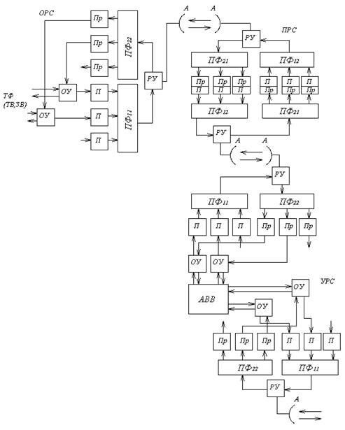 В качестве примера, поясняющего принцип организации многоствольной работы, рассмотрим вариант РРЛ из трех дуплексных стволов. На рисунке 1.2.2 представлена упрощенная структурная схема основного оборудования трех станций этой линии: ОРС, ПРС, и УРС. Схема содержит: передатчики (П); приемники (Пр); оконечные устройства (ОУ), включающие модемы, усилители и другие элементы, осуществляющие преобразование групповых телефонных сообщений (ТФ) или компонентов сигналов телевизионного и звукового вещания (ТВ, ЗВ) в сигналы линейного тракта, а также обратное преобразование: системы полосовых фильтров (ПФ), каждый из которых имеет полосу прозрачности, соответствующую одному стволу при односторонней связи; в режиме передачи ПФ обеспечивает необходимую развязку передатчиков (у этих систем ПФ указан первый индекс 1, то есть они обозначены ПФ11, ПФ12, ПФ13; изменение вторых индексов отражает смену частот приема и передачи в соответствии с двухчастотным планом); в режиме приема системы ПФ являются разделительными фильтрами: из суммарного ВЧ сигнала каждый полосовой фильтр системы выделяет сигнал одного ствола и направляет его в соответствующий приемник (у этих систем ПФ указан первый индекс 2, то есть они обозначены ПФ21, ПФ22, ПФ23); развязывающие устройства (РУ), задачей которых является дополнительное уменьшение взаимовлияния трактов передачи и приема: ряд элементов этих трактов, таких, например, как фидеры и антенны (А), как правило являются общими. Аппаратура ввода-вывода сигналов (АВВ) обеспечивает решение специфических для УРС задач – разветвления и объединения информационных потоков.