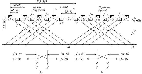 Рассмотрим один из вариантов конкретного частотного плана и некоторые примеры схем антенно-фидерных трактов (АФТ) многоствольных систем. На рисунке 1.2.3, а представлен план распределения частот, применяемый в магистральных радиорелейных системах «Восход», «Рассвет-2», «Курс-4», работающих в диапазоне 3.4…3.9 ГГц, в системе «Курс-6», работающей в диапазоне 5.67…6.17 ГГц и в зоновой системе «Курс-8», работающей в диапазоне 7.9…8.4 ГГц. Этот план позволяет организовать до восьми дуплексных широкополосных стволов по двухчастотной системе. Каждый из стволов может использоваться для организации телефонных каналов (до 1920) или для передачи телевизионной программы. Как видно из рисунка 1.2.3, а, несущие частоты стволов (f1,f2,…,f16 – отложены на оси fс) разнесены на интервалы, кратные F = 14 МГц. План рассчитан на промежуточную частоту Fпч = 5F = 70 МГц. При этом частоты гетеродинов (помечены точками на оси fг) размещаются в интервалах между рабочими частотами стволов, а частоты зеркальных каналов (помечены точками на оси fз) – внутри полосы, выделенной для системы. Частоты приема и передачи в одном дуплексном стволе разнесены на величину 19F = 266 МГц. Для соседних по частоте стволов в диапазонах, близких к 4 и 6 ГГц, должны использоваться различные антенны и разные типы поляризации волн – горизонтальная (г) и вертикальная (в). Распределение волн по поляризации на частотах приема (fпр) и передачи (fп) должно соответствовать рисунку 1.2.3, а, б или в. Обычно стволы разбиваются на две перемежающие группы. Одна группа стволов, например с нечетными номерами, используется для магистральных линий, а другая (с четными номерами) – в линиях, являющихся ответвлениями от магистрали, как показано на рисунке 1.2.4, а. Пример разнесения сигналов по разным антеннам на ПРС для шести дуплексных стволов показан на рисунке 1.2.4, б. Частотный план на рисунке 1.2.3, а предусматривает, что разность между частотами соседних стволов в одной антенне составляет величину 4F = 56 МГц, а в разных антеннах – 2F = 28 МГц; разность между ближайшими несущими частотами приема и передачи в разных антеннах – 5F = 70 МГц, в одной антенне – 7F = 98 МГц. Заметим, что система «Курс-8», функционирующая в диапазоне 7.9…8.4 ГГц при соответствующей компоновке АФТ (рисунок 1.2.5) допускает работу восьми дуплексных стволов на одну антенну. Разнесение сигналов разных стволов по частоте, по поляризации и по различным ветвям антенно-фидерного тракта, а также соответствующий выбор частот местных гетеродинов – все это в совокупности обеспечивает минимум внутрисистемных помех без значительного расширения частотных интервалов между стволами.
