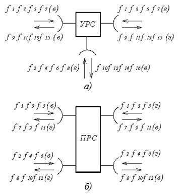Приемники, подключенные к РФ1 и РФ3, и передатчики, соединенные с РФ2 и РФ4, обеспечивают дуплексную связь в одном направлении. Путь сигналов (на несущих f1…f16) каждого из стволов нетрудно проследить по схеме, руководствуясь направлением соответствующих стрелок.