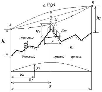 Профилем пролета называется вертикальный разрез местности между двумя соседними радиорелейными станциями с учетом леса, строений и особенностей рельефа. Пример такого профиля показан на рисунке 1.5.4. При этом в качестве определяющего параметра выбирается величина просвета (зазора) Н между линией «прямой видимости» АВ, соединяющей центры антенн, и ближайшей к ней (по вертикали) точкой препятствия С (на рисунке 1.5.4 изображен вариант профиля с одним препятствием; в специальных пособиях по расчету и проектированию РРЛ рассматриваются также профили, когда в минимальную область пространства попадает несколько препятствий). Просвет Н считается положительным, если линия АВ проходит выше препятствия, и отрицательным, если эта линия пересекает профиль пролета.
