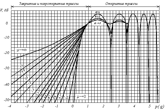 Рисунок 1.5.5 – Зависимость множителя ослабления V от относительного просвета p(g) и параметра μ.