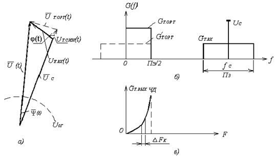 На рисунке 1.5.1,а представлена векторная диаграмм, из которой видно, что в результате сложения случайного вектора шума Uт.вх(t), отображающего uт.вх(t), с вектором сигнала Uc, отображающим uс(t), образуется случайный вектор U∑(t), отображающий суммарный сигнал