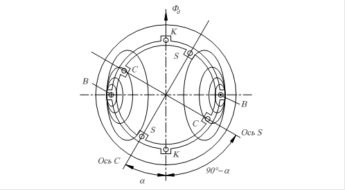 Предположим, что ось фазы С обмотки ротора сдвинута относительно фазы В обмотки статора на некоторый угол . В этом случае максимальное значение потока, сцепленного с обмоткой С: