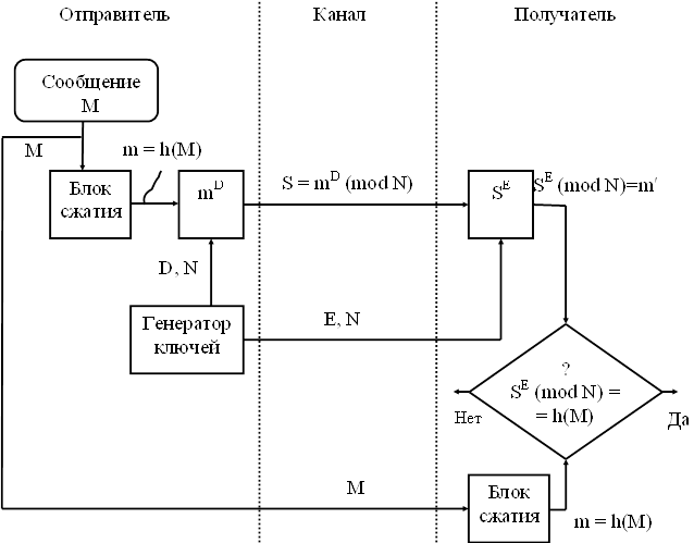Обобщенная схема формирования и проверки цифровой подписи RSA показана на рис.6.4.