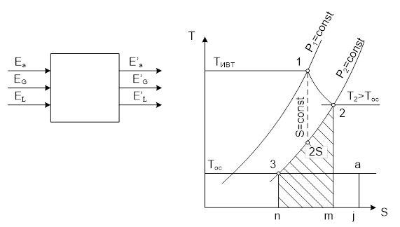 При эксергетическом анализе составляют балансы эксергии на входе и выходе, анализируемого участка системы. Например, на входе: ЕQ + ЕG + ЕL ≥ ЕQ’ + ЕG’ + ЕL’.
