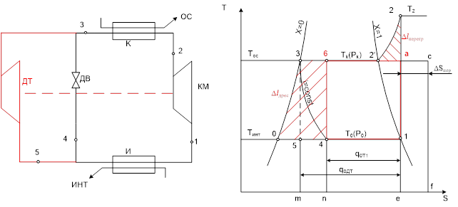 Работа детандера эквивалентна площади 5-3-0. В базовом цикле детандер отсутствует и не возвращается его работа 3-5-0. Процесс расширения в детандере заменен на процесс дросселирования 3-4, который сопровождается необратимыми потерями и снижением холодопроизводительности.