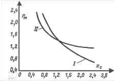 Рисунок 5.3 - Зависимости идеального предела мощности от индуктивного сопротивления системы. I—без учета изменения э.д.с. генератора; II — с учетом изменения э.д.с. генератора |