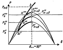 продолжает возрастать. Однако ток возбуждения и э. д. с. генератора также начинают изменяться и режим работы генератора переходит с одной характеристики мощности на другую, что не только замедляет снижение мощности генератора, но в дальнейшем приводит к увеличению мощности генератора с ростом угла. В точке b избыток мощности исчезает, но инерция ротора обусловливает дальнейшее увеличение угла, сопровождаемое ростом мощности генератора. Избыток мощности генератора затормаживает ротор, и в точке с достигается максимальное значение угла, после чего угол начинает уменьшаться. После того как будет пройдена точка d, лежащая на внешней характеристике мощности, регулятор напряжения начинает уменьшать напряжение возбудителя и кривая изменения мощности генератора пересекает семейство внутренних характеристик мощности в обратном направлении в соответствии с уменьшением э. д. с. Е. После нескольких циклов колебания затухают и устанавливается первоначальный режим работы в точке а.