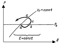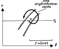 начинает нарастать (или уменьшаться). После того как будут пройдены границы зоны нечувствительности, регулятор начинает работать и, изменяя э. д. с. генератора, может затормозить его и ограничить нарастание угла, так же как и в случае, рассмотренном на рис. 5.14. Однако если в результате затухания колебаний процесс и возвратился бы к исходным параметрам, характеризуемым точкой а, то в силу внутренней неустойчивости режима в этой точке колебания немедленно возникли бы снова.