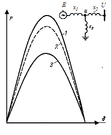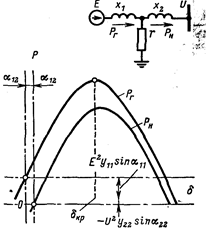 Характеристика мощности имеет тот же вид, что и при схеме замещения электропередачи с последовательным соединением реактивных сопротивлений, с той только разницей, что вместо суммарного индуктивного сопротивления