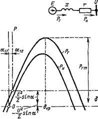 за счет перемещений вектора U исключена. В этих условиях устойчивость системы передачи связывается исключительно с характеристикой мощности генератора и нарушение устойчивости происходит при неизменной э. д. с. Е при достижении максимума этой характеристики, равного :