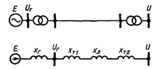 Рисунок 5.8 – Принципиальная схема и схема замещения электропередачи |