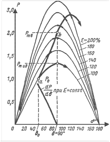 Зависимости активной мощности от угла сдвига вектора э. д. с.
