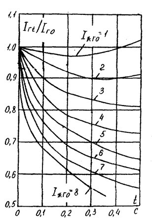 Метод типовых кривых является развитием метода расчетных кривых, который изложен выше. Типовые кривые используются для расчета периодической составляющей тока КЗ в произвольный момент времени. Кривые применимы для генераторов и крупных синхронных компенсаторов. Кривые дают зависимость изменения во времени отношения действующего значения периодической составляющей тока КЗ от генератора в произвольный момент времени