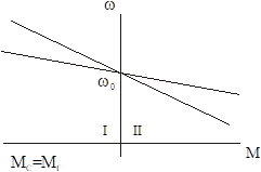 Характеристика двигателя при его разгоне (он включается в направлении спуска груза) пойдет из III квадранта в IV. После достижения скорости - w0 система будет разгоняться менее интенсивно, т.к. знак момента двигателя меняется на обратный. При некоторой скорости наступит равновесие моментов Мдв=Мс. Груз будет спускаться с постоянной скоростью wУ.