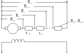 , двигатель начнет разгоняться, а ток якоря будет уменьшаться. По достижении им значения, равного IЯ2, часть сопротивления отключается, ток скачком возрастает до значения IЯ и двигатель переходит для работы на новой характеристике (от т.d), на которой он будет работать до т.n, где выключается следующая ступень пускового сопротивления и т.д. до выхода на естественную характеристику в т.b. Если это не получится, необходимо изменить значение тока IЯ2 и выполнить построение пусковой диаграммы заново т.о., чтобы переход с последней пусковой характеристики на естественную произошел именно при токе IЯ1 (в т. в). Обозначив сопротивление якорной цепи при пуске Rm (см. схему включения сопротивлений на рис.), на 2-й через Rm-1 и т.д., то сопротивлению Rm на пусковой диаграмме соответствует отрезок ае, сопротивлению Rm-1 – отрезок ad и т.д. Отключаемым на каждой ступени сопротивлениям соответствуют отрезки de,cd,bc. Масштаб сопротивлений можно найти исходя из отрезка ав и известной величины RЯ. Но т.к. отрезок ав невелик и это может вызвать большую погрешность, удобнее находить масштаб по отрезку ае. Этому отрезку соответствует