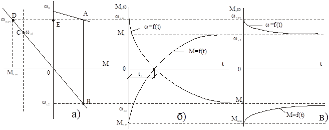 В случае активного Мс точка “B”, соответствующая установившейся скорости wс2, относится к случаю, когда этот момент в начале процесса является тормозным, что имеет место, например, при подъеме груза, а т. “c” с установившейся скоростью wс1- к случаю, когда этот момент является движущим, например, при спуске груза (рис.а).