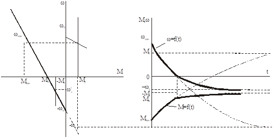При реактивном моменте сопротивления процесс разбивается на два этапа. На первом этапе, являющемся тормозным, законы изменения w и М описываются теми же уравнениями что и при активном Мc. Время торможения до w=0