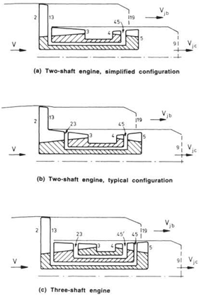 Было показано, что есть практические трудности в использовании компрессоров с большими степенями сжатия на одном валу. И степень сжатия на одном валу обычно ограничивается величиной порядка 20. Причина трудности состоит в том, что безразмерный массовый расход на выходе из компрессора является почти постоянным, и снижение полной степени сжатия со снижением угловой скорости приводит к понижению массового расхода на входе в компрессор, большему по сравнению со снижением угловой скорости вращения. У двигателей, рассмотренных в предыдущем темах, была полная степень сжатия 40 в крейсерском полете, из которой 1.6 произведено в корне вентилятора и 25 в ядре. У упрощенного проекта, основного на этом, был один только вентилятор на валу низкого давления и все оставшееся сжатия совершалось в основном HPC, см. рис. 12.7 (а). глядя на проекты двухвальных двигателей выполненных Pratt и Whitney? Рис. 5.4 (b), и Дженерал Электрик, рис. 5.4 (с), можно заметить, что часть сжатия потока внутреннего контура производится на валу низкого давления в подпорных (бустерных) ступенях. Поэтому более реалистичное расположение сечений для двухвального двухконтурного двигателя показано схематично на рис. 12.7 (b).