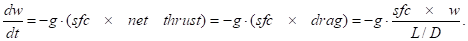 На самом деле ситуация более сложна чем это кажется, потому что удельный расход топлива - функция от скорости полёта, и в действительности должен достигать своего максимального значения показатель (V / sfc) ∙ (L / D).