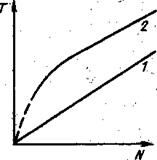 Рис. 1.3. Зависимость усилия сдвига Т от нормального усилия N для идеально сыпучего материала (1) b для топлива с ухудшенной сыпучестью (2)
