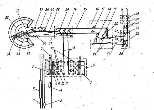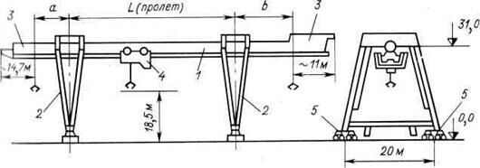 1 - мост; 2 - нога; 3 - консольные выступы; 4 - тележка с грейфером; 5-ездовые рамы