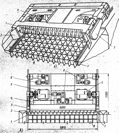 Кран-перегружатель (рис. 1.17) состоит из моста, установленного на двух опорах (одна жесткая, другая гибкая либо обе жесткие). Консоли моста позволяют крану подавать уголь на склад и выдавать его со склада. Краны-перегружатели имеют пролет 60 или 76,2 м. Первые из них имеют ковш вместимостью 7,5 м и производительность до 400 т/ч, а вторые — 12 м3 и до 700 т/ч. Выход грейфера в наружные от опор стороны может быть следующим: