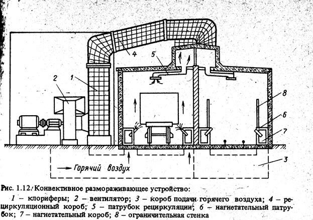 излучателям со стороны потолка и стен крепятся отражательные алюминиевые листы. Калориферы не предусмотрены. На кровле разморажиющего устройства установлены вентиляторы. Они забирают воздух из верхней части размораживающего устройства и подают его в проходящие