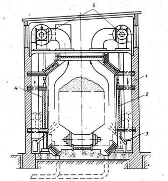 1 - здание размораживающего устройства; 2 - трубчатые излучатели; 3 - сопла; 4 – металлический экран; 5 - вентилятор